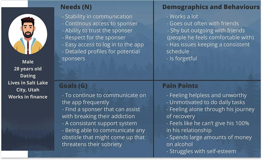 Addiction is one of the most prevalent diseases of our day. The American Addiction Centers reported that 46.8 million Americans aged 12 and up have battled a substance use disorder in the past year, with 10.5% of Americans having battled alcohol use (2024). With this in mind, we decided to focus on people that are on their recovery journey from addiction. We’ve learned that one way to help them is to facilitate their connection with a sponsor—someone who can be on call 24/7 to hold them accountable in their healing journey.